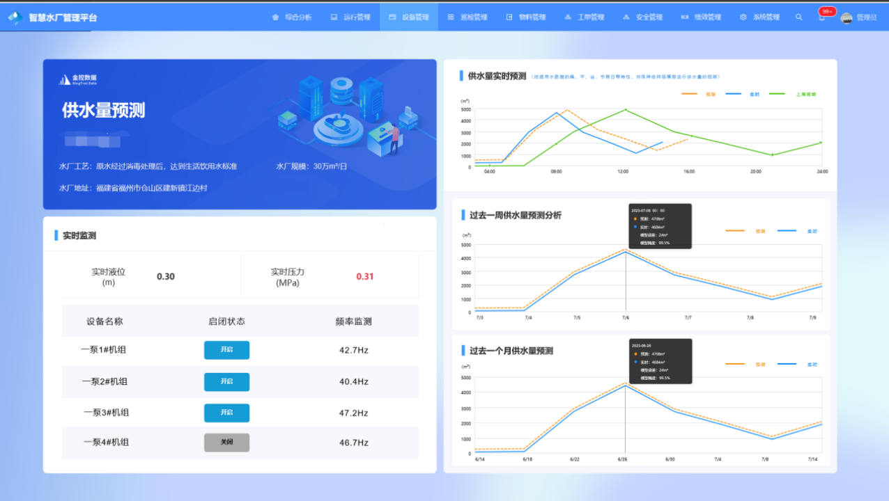 立足水廠管理者角度,通過(guò)一圖觀全局,了解水廠的水量、水壓、水質(zhì)、泵組效率、泵站運(yùn)行、能耗情況、設(shè)備健康情況、報(bào)警情況,保證水廠安全生產(chǎn)、透徹感知、平穩(wěn)可靠運(yùn)行。